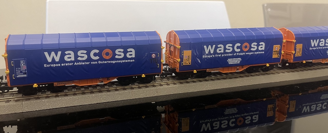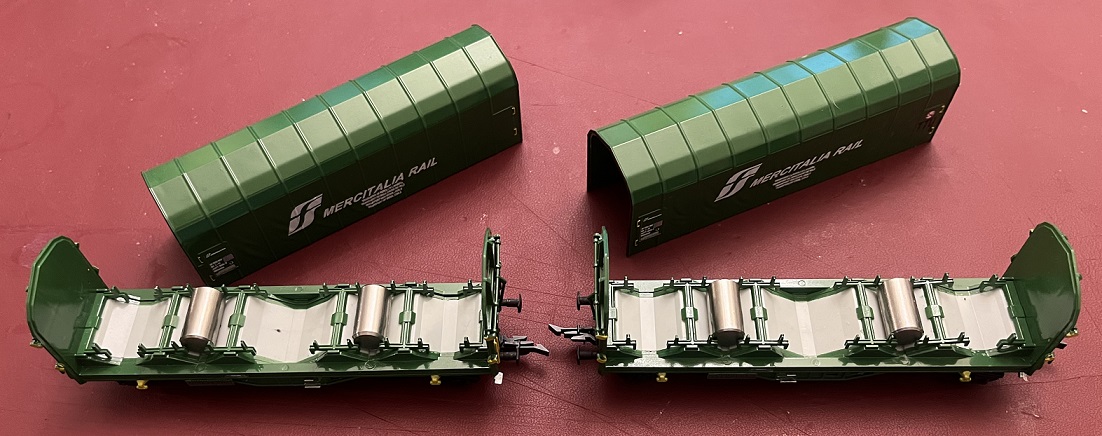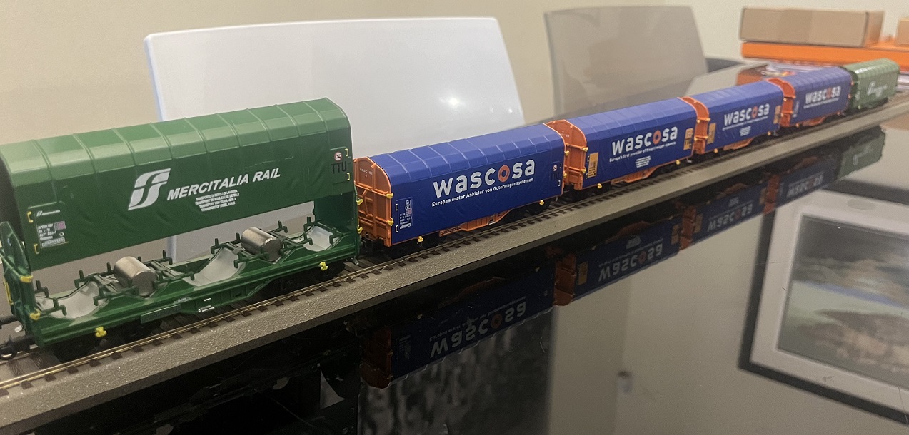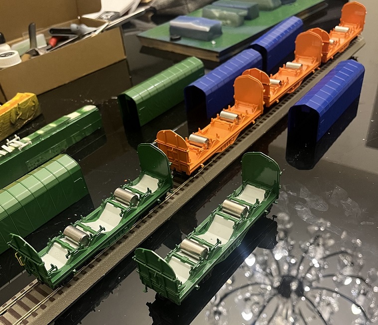 I carri sono della tipologia telonata per trasporto di Coils di lamiera e la mia idea era di realizzarne alcuni nella vistosa colorazione Wascosa arancio/blu e alcuni nel verde Mercitalia (Tutti colori che intendevo reperire nei negozi di vernici in bomboletta e così è stato).