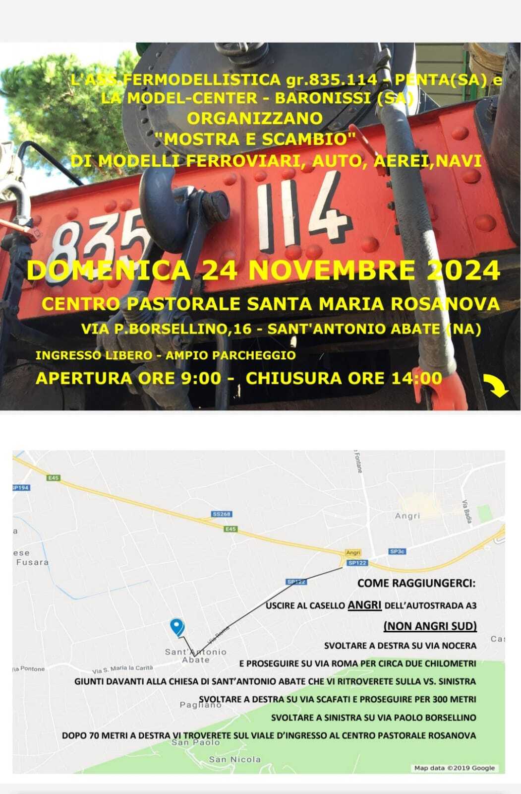 Ciao a tutti il Domenica 24 NOVEMBRE 2024 dalle ore 09.00 alle ore 14.00 presso il centro Pastorale Santa Maria Rosanova via Borsellino nr.16 in Sant'Antonio Abate (Na) L'associazione Modellistica Gr835 114 Penta (Sa) in collaborazione con il negozio MODEL Center di Baronissi (Sa), organizzano "MOSTRA e SCAMBIO"di Modelli ferroviari, auto, aerei e navi .